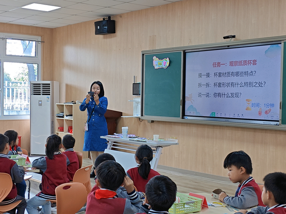 第一节课由许佳宁老师执教《杯套》一课,课程从生活实际出发,通过触摸热水杯的情境导入,自然地引出杯套制作主题。在老师的引导下,学生对纸质杯套进行观察。接着,通过视频学习杯套模型制作和杯套制作。课堂上,学生们积极参与,锻炼了动手能力和团队合作意识,装饰杯套的任务更为学生提供了发挥创意的空间。