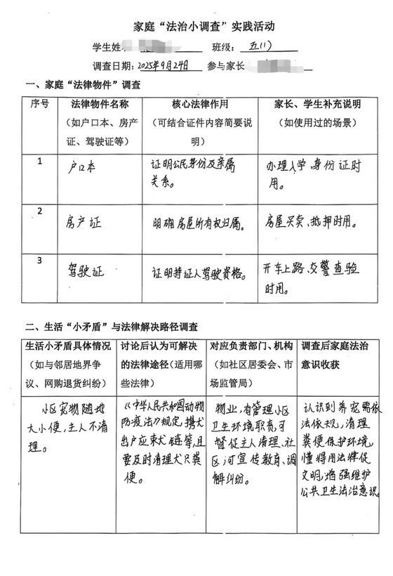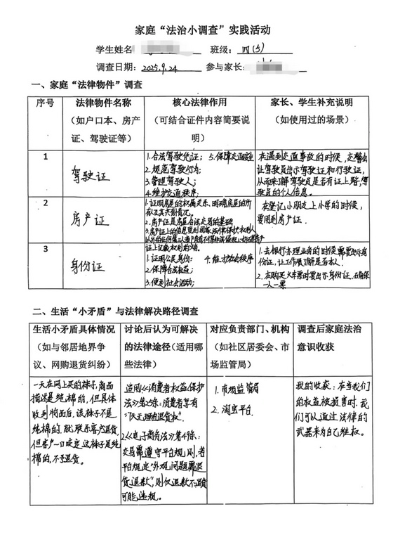 本次法治宣传教育周的最大亮点,在于将教育场景延伸至家庭,以“实践+互动”的形式推动家长深度参与。学校通过“告家长书”向全体家长发出倡议,邀请家长加入法治教育共育队伍,并同步推出“家庭法治小调查”实践活动,家长们和孩子一起梳理家中的“法律物件”(如身份证、房产证、疫苗本等),讲解其法律意义;探讨如何通过法律途径解决生活中的“小矛盾”(如邻里纠纷、消费维权等);记录“家庭法治学习心得”,分享教育感悟。