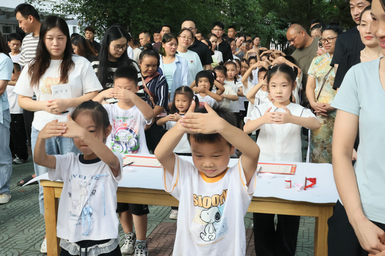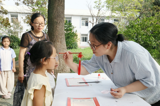 最令人期待的“点朱砂”环节,校领导与教师手持朱砂笔,在每个孩子额头轻点红痣,轻声送上“聪慧明目,好学上进”的祝福,红色的印记仿佛为孩子们点亮了智慧的双眼。