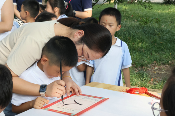 “人生聪明识字始,做人先于治学。”曹校长现场挥毫,在卷轴上写下苍劲的“人”字,边写边为孩子们讲解“人”字的书写意义与做人道理。孩子们或手握毛笔描红,或举起小手“书空”,在笔墨香中感受汉字魅力与做人准则。