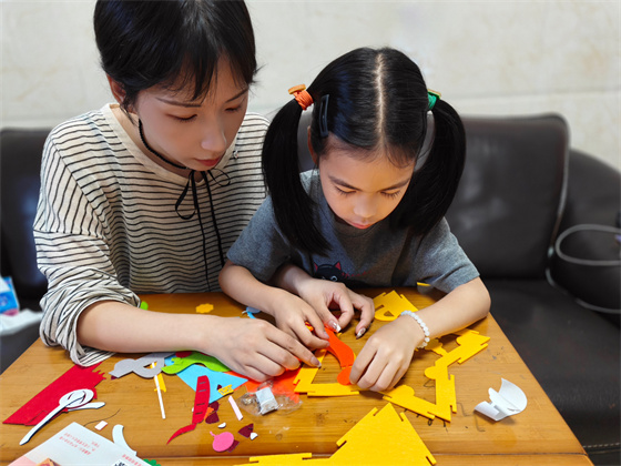 二年级的孩子们和家长合作制作灯笼,他们共同折叠框架、粘贴图案、安装灯穗和提杆……每一个步骤都凝聚着亲子的默契与智慧。有的孩子在灯笼上写下祝福语,有的画上国旗、月亮等元素,将家国情怀与传统节日巧妙结合。