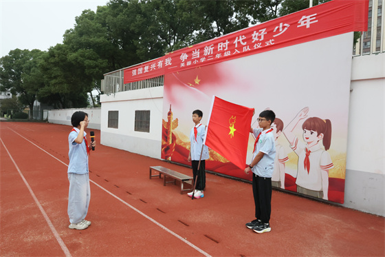 仪式在激昂的出旗曲中拉开帷幕,大队旗手和护旗手迈着整齐的步伐入场,全体少先队员注视着大队旗,心中充满了光荣与自豪。随后,《中国少年先锋队队歌》的旋律响彻校园,整个操场成为红色信念传递的海洋。