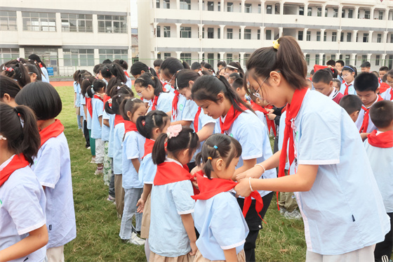 冯凯副书记宣读新队员名单,队员们眼神坚定,满是期待。五年级的老队员们手持崭新的红领巾,郑重地为新队员系在胸前。当鲜艳的红领巾在胸前飘扬,新队员们纷纷抬手敬起标准的队礼,脸上洋溢着自豪的笑容。