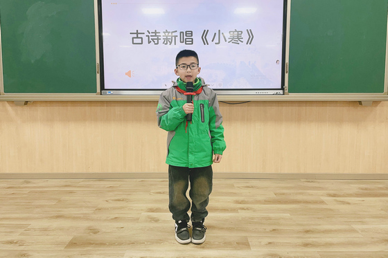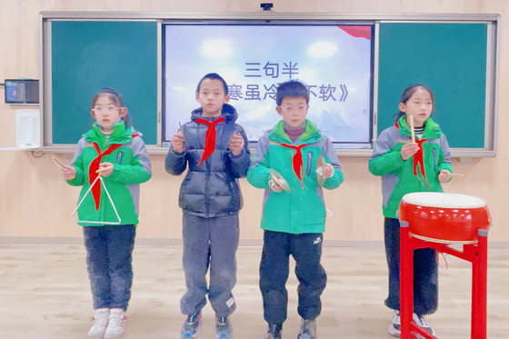 在庄严的国歌声中,全体师生肃立敬礼,爱国情怀在心中激荡。两位小主持人围绕小寒节气展开分享,介绍了小寒的节气特点、文人笔下的小寒意境,还现场吟唱宋代诗人杜耒的《寒夜》,带领师生感受传统文化魅力。同时,主持人分享了寻梅赏花、描画九九消寒图、煮腊八粥等小寒习俗,让大家在了解节气知识的同时,感受传统民俗的烟火气。